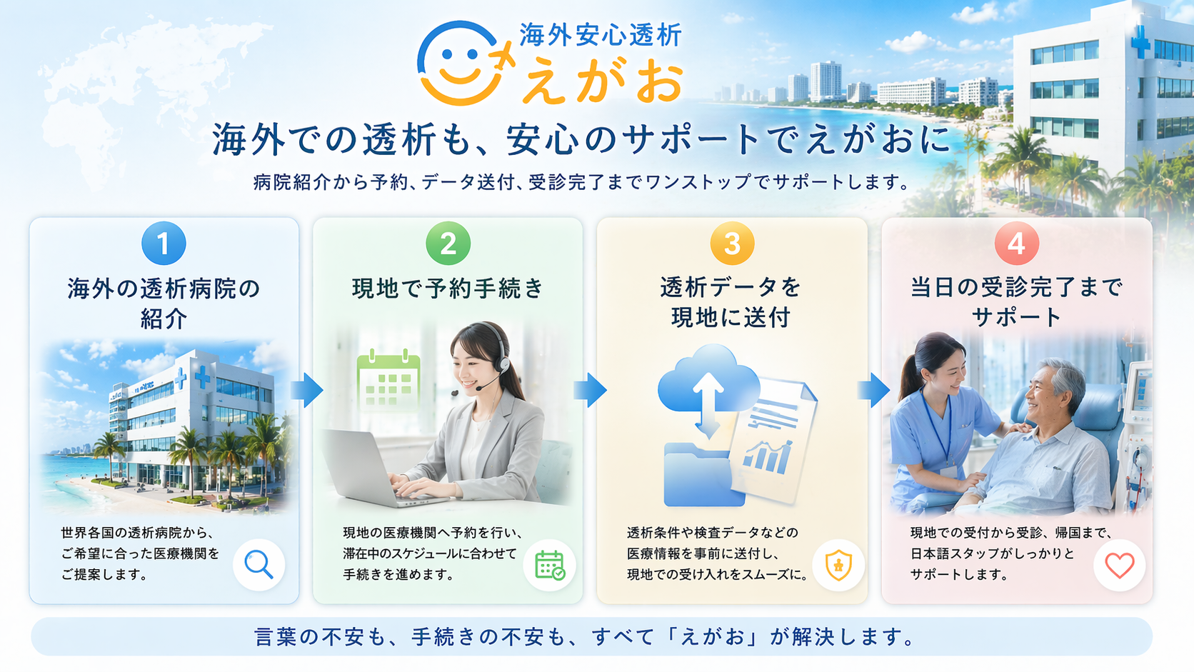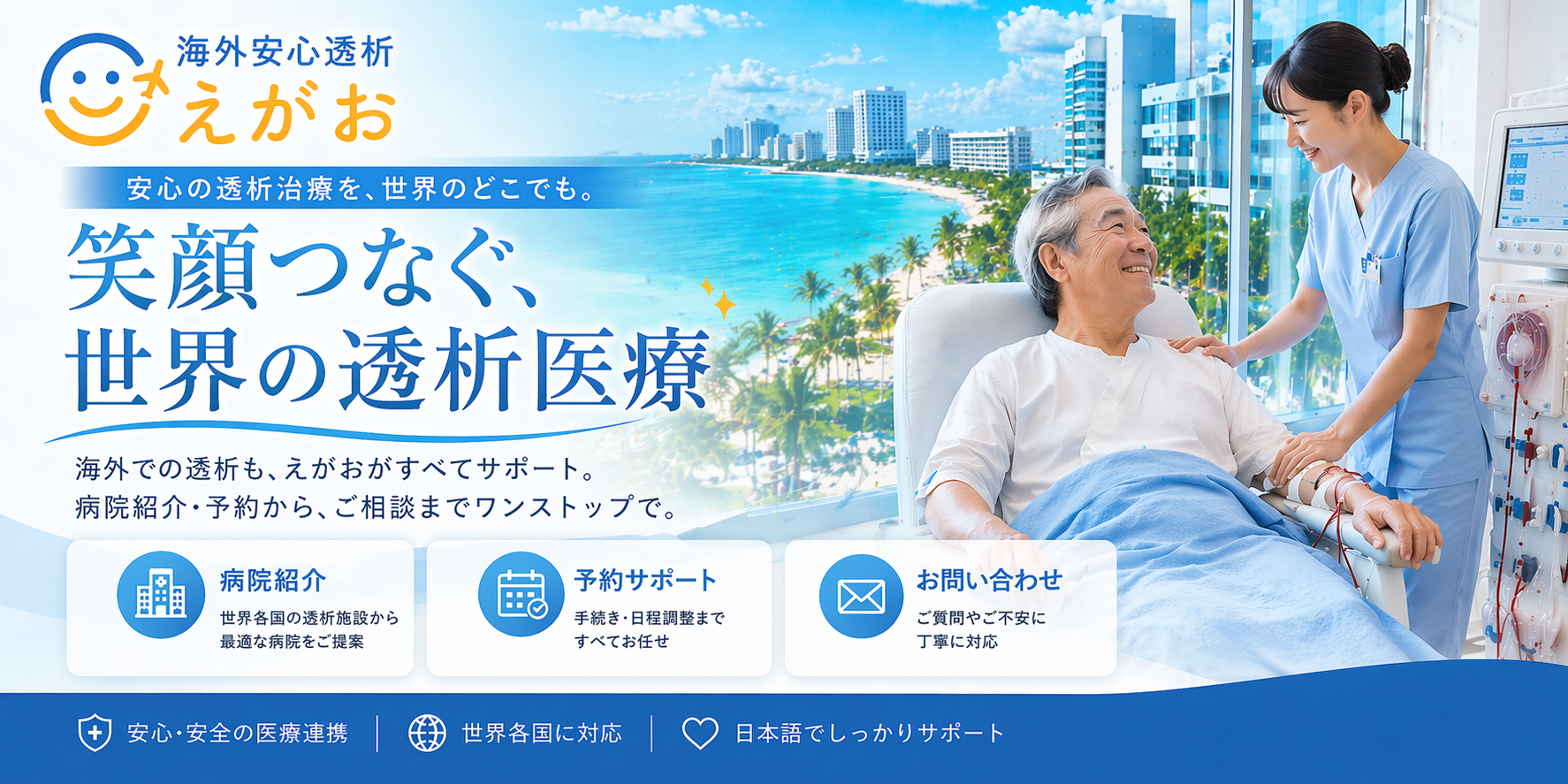 海外安心透析『えがお』は、お客様の立場に立った、丁寧・親身・料金を心がけ、