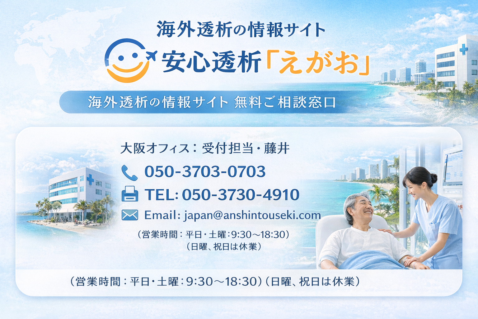 安心海外透析『えがお』は、世界各地の医療アシスタントを通して、最新の医療事情・健康情報の把握に努めております。日本人医師・日本語対応の医療通訳常駐の病院・海外旅行保険の適用条件など、日本人の患者様に安心してご活用いただける医療情報をお届けすることが運営の理念です。健康・医療に関するご相談は、お気軽にご連絡ください。